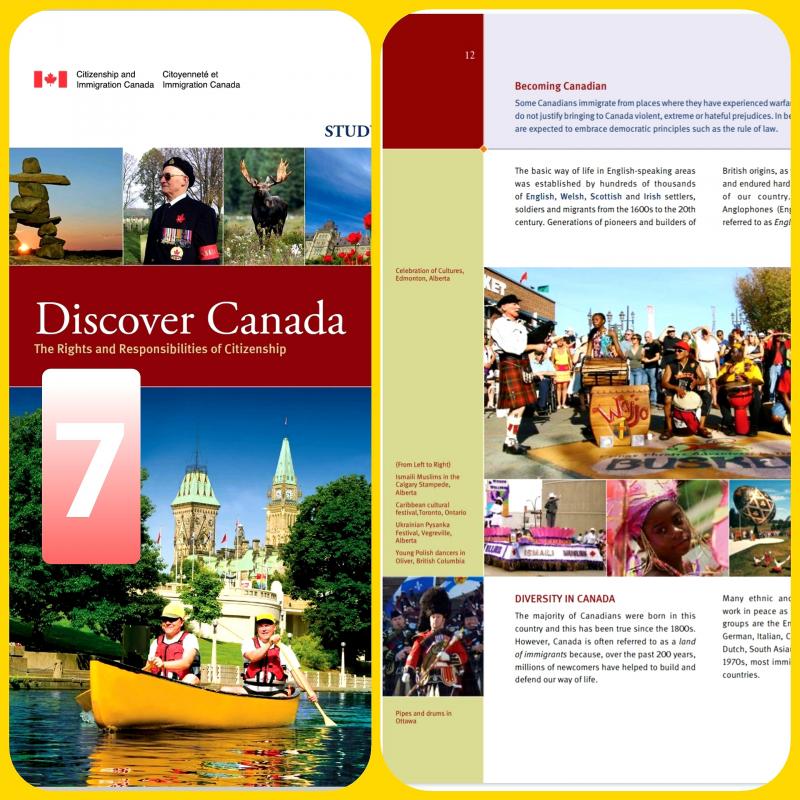 تنويه مهم: تجاوزاً تمت ترجمة كتاب Discover Canada بالعربية بهدف مساعدة من لديه ضعف بالإنكليزية أو الفرنسية لاستيعاب مقرر الجنسية عند الحاجة، (ولا ننسى أن من واجب المتقدمين للجنسية أن يكون لديهم معرفة كافية بإحدى اللغتين الإنكليزية أو الفرنسية). لا شك أن الترجمة تساعد وهي حل أخير، ولكن لا تغني أبداً عن قراءة ودراسة الكتاب باللغة الإنكليزية أو الفرنسية لأن الاختبار بالنهاية لن يكون بالعربية.